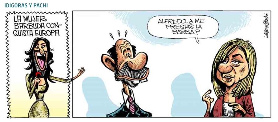 En fin, no nos vayamos por las ramas. Genial caricatura de Alfredo, con dos piños dignos de Bugs Bunny, narizota y orejones, amén de gran entrada. Eso sí, su estrecho cuello se le sale de la camisa con elegancia. Por su parte, la Valenciano, fantástica con su nuevo look, aunque para mí que lo lleva crudo. Ironia genial de la política y de uno de los festivales de la canción, Eurovisión, venido a menos, por mucho que los cantantes de segunda se empeñen en darle aire.