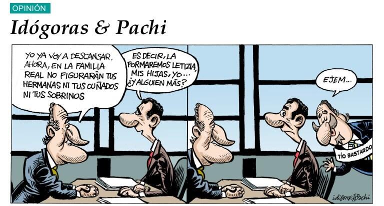 Genial viñeta en la que se escenifica el traspaso de la corona de padre a hijo, de acuerdo a las reglas establecidas, pero dejando claro que siempre hay una historia no escrita. Lo que sí quedará para siempre en esta viñeta es el desliz tipográfico en el ilustre nombre de nuestros ilustres viñetistas, Idígoras y Pachi, que no Idógoras. Hay cosas que no cambian nunca, aunque nos cambien el nombre o la CIA habra una cuenta en twitter @CIA.