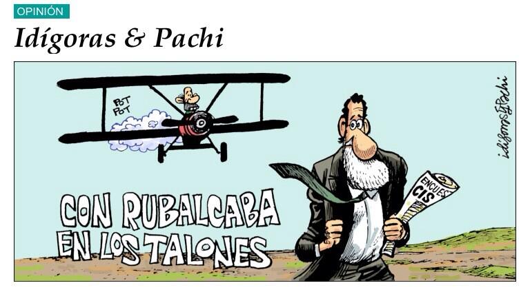 El 'pot pot' de la avioneta humeante pilotada por un Rubalcaba mostrando los mejor de sí mismo es sencillamente genial, pero ese medio plano de Rahoy corriendo con la corbata al viento y la encuesta del CIS en la mano, es sublime. El titulo, muy cinematográfico, hace el resto.
