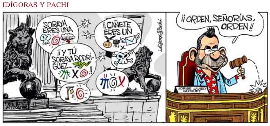 El paralelismo creado por Idígoras y Pachi en su viñeta es magistral, tan solo superado por el propio dibujo. en el que los insultos se convierten en símbolos. La genial caricatura del presentador, desde sus orejas hasta su camisa, hacen el resto.