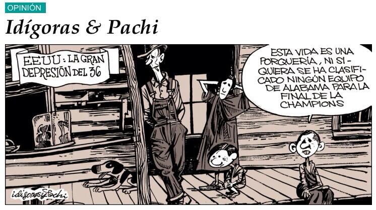 Una vez más Idígoras y Pachi reflejan magistralmente la historia adaptada a la realidad actual, con toda la ironía y genialidad de sus viñetas. La historia, la gran depresión que azotó Estados Unidos en 1936. La actualidad semanal, muy marcada con las semifinales de la Champions League...